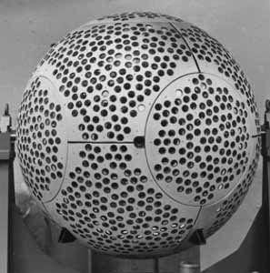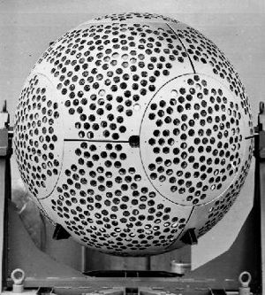 Russian earth geodetic satellite. Passive geodetic satellites, 1415 kg, 1.294 m in diameter, covered with 306 antenna arrays, each with 14 corner cubes for laser reflection. Geodesy satellite, Russia. Launched 1989.