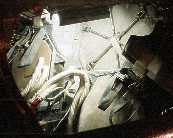 View of Gemini B hatch in heat shield, as seen from the interior. Compare it with the equivalent hatch in the Soviet TKS manned spacecraft.