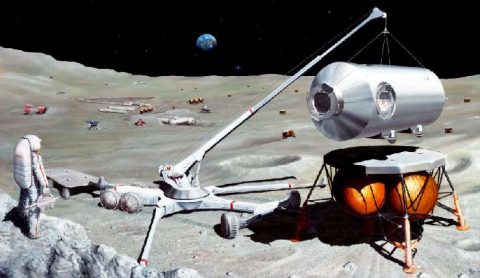 The lunar surface facility would have grown to an 18-crew "advanced base" in 2013-14, consisting of five habitation modules, a geochemical laboratory, chemical/biological lab, geochemical/petrology lab, a particle accelerator, a radio telescope, lunar oxygen, ceramics and metallurgy plants, two shops, three power units (90% lunar-materials derived), one earthmover/crane and three trailers/mobility units... The moonbase would eventually "pay for itself" by exporting lunar oxygen ("LunOX") to space industries in Earth orbit produced by lunar mining and oxygen production/manufacturing facilities like the one shown here.
