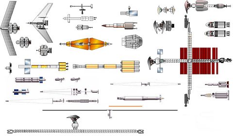Leading manned Mars Expedition designs to a common scale (the orange bar represents 100 m). Upper left: Von Braun, 1948-1956; top middle, NASA EMPIRE, UMPIRE; Stuhlinger 1962; Bono Deimos; middle, NASA TRW, MPRG, IMIS, 1965-1971; upper right, STCAEM, SAIC, Design Reference Missions, 1983-2001; bottom rows, Russian designs, 1956 to 1986; below orange bars, Russian and American solar-electric designs.
