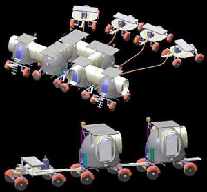 It was composed of several modules that would land and assemble autonomously, forming a long duration manned base. Once the manned phase was complete, the modules would disassemble and move autonomously to an alternate lunar site, up to 1000 km away.