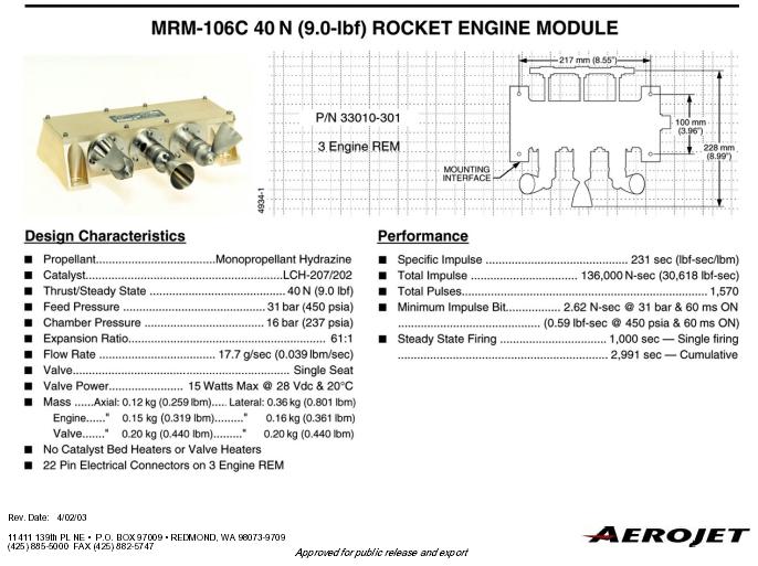Status: In Production. Thrust: 27 N (6 lbf). Unfuelled mass: 0.94 kg (2.07 lb). Specific impulse: 231 s. Burn time: 2,991 s. Height: 0.17 m (0.56 ft). Diameter: 0.0310 m (0.1010 ft).