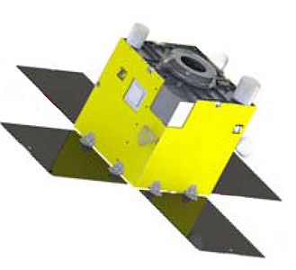 The spacecraft body is cube-shaped, 67 x 55 x 55 cm, with four solar panels, each roughly a 47 x 47 cm square, extending from the top. Total dry mass of the spacecraft is 65.5 kg, with an additional (approximately) 2 kg of xenon for propulsion. Mounted on the top of the spacecraft are a flat X-band high gain antenna and two small isoflux X-band low-gain antennae, one for uplink and one for downlink. An identical set of low gain antennae are mounted on the bottom. A flat X-band medium gain antenna is mounted on one of the sides. Communications are via a 15-W GaN-based solid state power amplifier and X-band transponder.