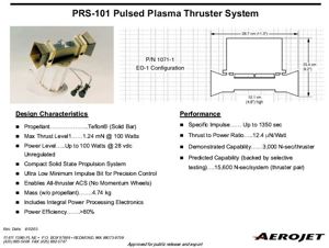 Redmond electric/Teflon rocket engine. In Production. Pulsed plasma thruster system. Completely solid state propulsion. Up to 100 W input power at 28 V DC, thrust to power ratio 12.4 microN/W.