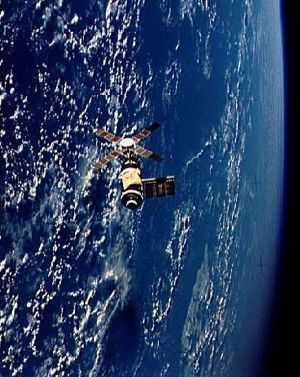 First and only US space station to date. Project began life as Apollo Orbital Workshop - outfitting of an S-IVB stage with docking adapter with equipment launched by several subsequent S-1B launches. Curtailment of the Apollo moon landings meant that surplus Saturn V's were available, so the pre-equipped, five times heavier, and much more capable Skylab resulted.